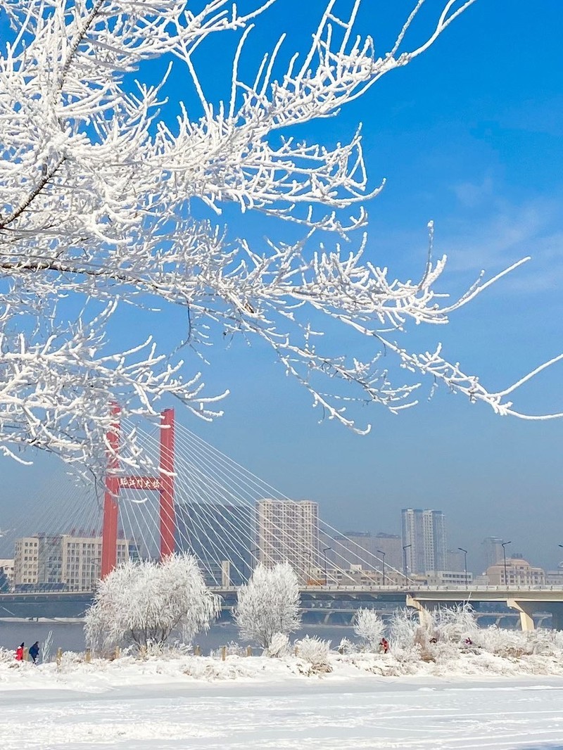 到了雾凇岛,小明被眼前的美景惊呆了,雾凇岛上的树木被冬天的雪花装点得如梦如幻,仿佛走进了童话世界,小明和小丽在雪地里打雪仗、堆雪人,欢声笑语回荡在空气中。